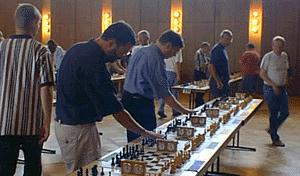 BlitzturnierAls Abschluss des Fernschachtreffens fand am Sonntag ein Blitzturnier mit 52 Teilnehmern statt, die in sieben Vorgruppen die Teilnehmer der vier Endrunden A bis D ermittelten. In das Finale A kamen jeweils die ersten Zwei der sieben Vorgruppen.Das Foto zeigt den Sieger Rudolf Rüther (links), der vom Turnierleiter Peter Schmidt (rechts) den Pokal überreicht bekam. Der Endstand im Finale A lautete: |
