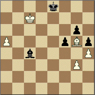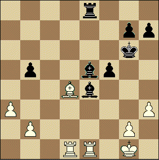 Diagramm 3: nach 64. Kd6-c7... Txd3 21.Dxd3 Sxe4 22.Dd7 Kf8 23.Dxe7+ Kxe7 24.Tfe1 c5 25.Sc3 Kf6 26.Sxe4+ Lxe4 27.Lxc5 Te8 28.Lxa7 Lxf4 29.Kg1 Kg6 30.Lc5 f5 31.Ld6 Lg5 32.Lc5 Lf4 33.Td7 Le5 34.Td2 Lf4 35.Tdd1 Le5 36.Ld4 {?} {Diagramm 2} Lc2 {!} {gewinnt die Qualitaet zurueck} 37.Txe5 Txe5 38.Lxe5 Lxd1 39.Kf2 h5 40.h4 Lb3 41.Ke3 Ld5 42.g3 Le6 43.Kd4 Lf7 44.Kc5 Le8 45.Kd6 Kh6 46.Lf4+ Kg6 47.Ke7 Lc6 48.Le5 Kh6 49.Lf4+ Kg6 50.Kd6 Le8 51.Ld2 Lf7 52.Kc5 Le8 53.b3 Ld7 54.Lc3 Kf7 55.Ld4 Kg6 (55...g6 56.Kb4 Lc6 57.a4 bxa4 58.bxa4 Ke6 59.a5 Kd7 60.Kc5 Le4 61.a6 Kc7 62.Le5+ Kd7 63.a7 La8 {Schwarz muss verhindern, dass der weisse Koenig nach b8 kommt!}) 56.Kb4 Lc6 57.a4 bxa4 58.bxa4 Lf3 59.Kc5 Kf7 60.a5 g6 (60...Ke7 61.Kb6 Kd7 62.Ka7 62...Kc8 {Schwarz verhindert Kb8!}) 61.Kd6 Le2 62.Le3 Ke8 63.Lg5 Lc4 64.Kc7 {Diagramm 3} Le6 {?} {entscheidender Fehler} (64...Le2 65.Kb6 [65.Kb7 Lf3+ 66.Kb8 Le2 67.Kb7 Lf3+ 68.Kb6 Kd7] 65...Kd7 {Verhindert Koenig nach b8, da Weiss erst Kb6 spielen muss, um seinen Bauern nach a6 ziehen zu koennen.}) 65.a6 Ld5 66.a7 Le4 67.Kb8 Kd7 68.a8=D Lxa8 69.Kxa8 Ke6 70.Kb7 Kd6 71.Lf4+ Kd5 72.Kc7 Ke4 73.Kd6 Kf3 74.Ke5 Kg4 75.Kf6 Kf3 76.Kxg6 1-0