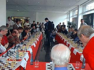 links stehendAm 17. Juli 2001 spielt Wladimir Kramnik in der Stadtsparkasse gegen 23 Gegner simultan. Er gewinnt 20 Partien und gibt drei remis.