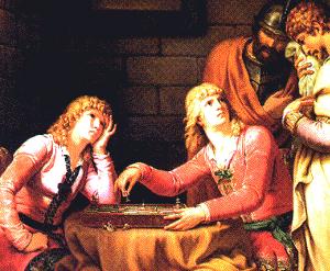 Vom 23. August bis ersten September 1996 fand in Friedrichroda die achte offene Deutsche Meisterschaft der Seniorinnen und Senioren statt. Für die Teilnehmer wurde ein Ausflug zum Barockschloss in Gotha organisiert, wo es prächtige Bilder zu bewundern gab, unter anderem eines zweier Schachspieler.Das rechte Bild [fotodesign sauer Gotha] von Tischbein zeigt Konradin von Schwaben, den letzten Staufer und Friedrich von Österreich beim Schachspiel im Gefängnis, als sie ihr Todesurteil erhielten. Konradin wurde 1268 von Karl von Anjou besiegt, durch Verrat gefangen und nach einem Scheinprozess in Neapel enthauptet. Gemalt wurde das Bild 1784. |